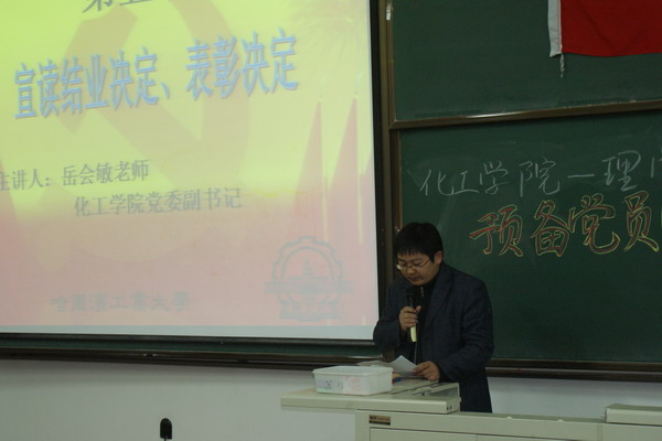 2010年11月30日,化工学院—理学院预备党员党校结业式在正心13顺利举行。理公司党委副书记杨春雷、化工公司党委副书记岳会敏出席了结业式,结业式由贾洁姝同学主持。 结业式在庄严的《中华人民共和国国歌》和《哈工大党校校歌》中拉开帷幕。到会嘉宾和全体学员一起观看了党校总结视频,对一个月的党校学习进行了回顾。本次党校自 结业式在庄严的《国际歌》中画上了圆满的句号。